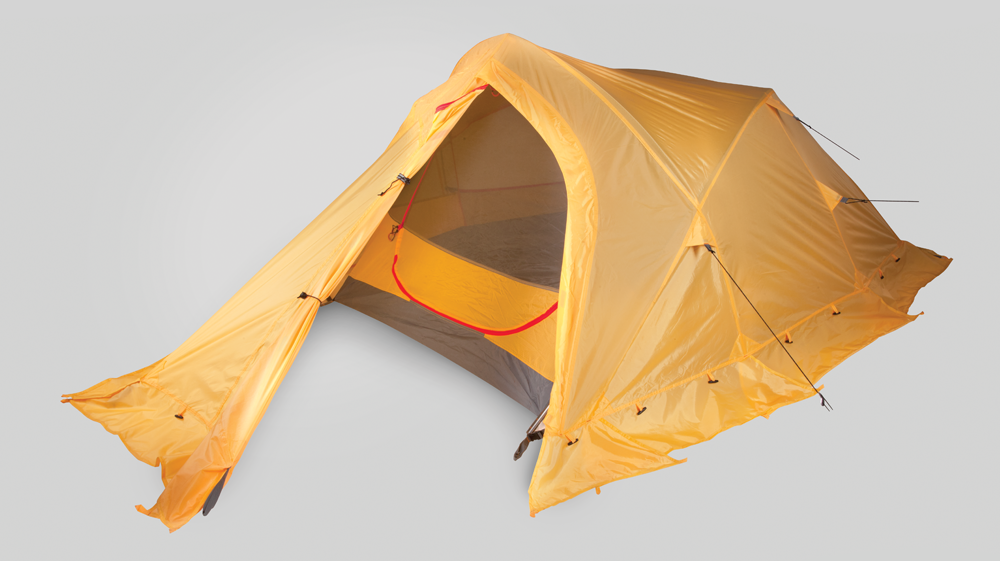 Обычная двухместная палатка за счет интересной формы с просторным тамбуром преобразилась в расширенный вариант обители, позволяя разместить все снаряжение без загромождения основного пространства палатки. Основой устойчивого и легкого каркаса служат 3 дуги, специально промаркированные своим цветом для простоты установки.