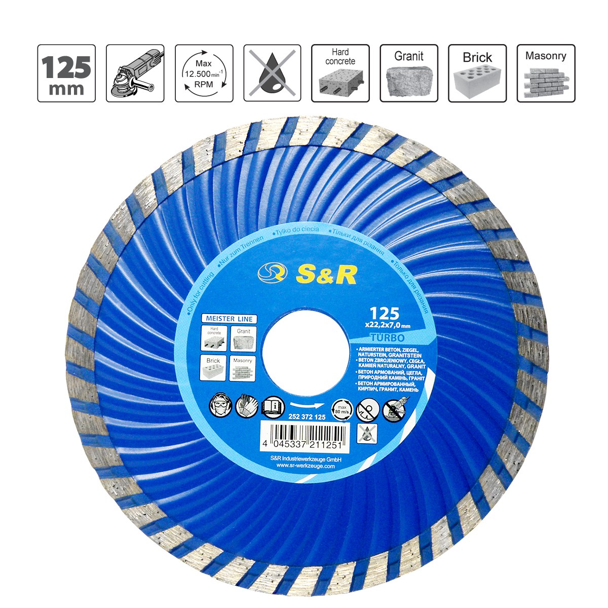 S&R Meister по армированному бетону 125 мм. - отрезной алмазный диск серии TURBO, предназначен для работы с таким материалом:
