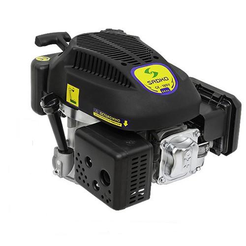 При подборе двигателя под конкретный вид техники, надо учесть, что на двигателе Sadko GE-160V вал расположен вертикально и является валом шпоночного типа. Двигатель выполнен в алюминиевом корпусе, вес его составляет не более 14-ти килограмм. У него также интегрированы такие элементы, как топливный бак (объемом 1.2 литра), масляный бак (объемом 0.5 литра), ручной стартер. Надежности двигателю добавляет также улучшенный воздушный фильтр двойной очистки - с бумажно-поролоновым элементом фильтрации.