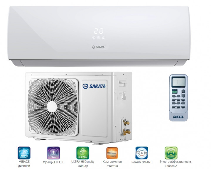 - Передняя панель всех настенных сплит-систем выполнена из светопрозрачного пластика, благодаря которому реализована разработка Sakata — MIRAGE дисплей, который остается абсолютно незаметным, если кондиционер выключен.