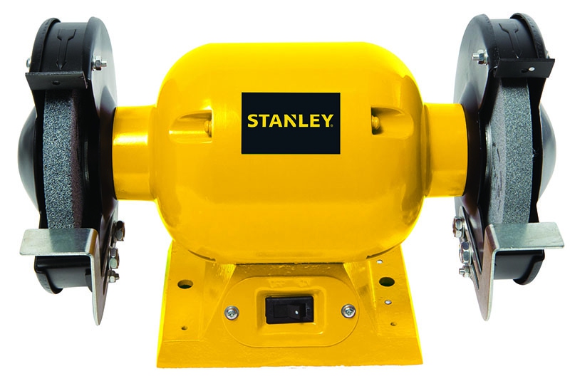 Двухдисковый точильный станок STGB3715 от Stanley, предназначен для операций ручного шлифования, таких как заточка ручного инструмента, удаление излишков металла, а также выравнивание металлических поверхностей, посредством грубой и окончательной шлифовки с использованием шлифовальных дисков различного назначения и зернистости. Модель оборудована асинхронным электродвигателем мощностью 383 Вт, который разгоняет два шлифовальных диска диаметром 152 мм и толщиной 16 мм до скорости 3450 оборотов в минуту. Первый из дисков, для чернового шлифования с крупной зернистостью, и второй, для чистового шлифования с мелкой зернистостью закрыты с боков защитными кожухами. В комплекте со станком идут два искрозащитных экрана и две опоры для заготовки, что делает работу с точильным станком.