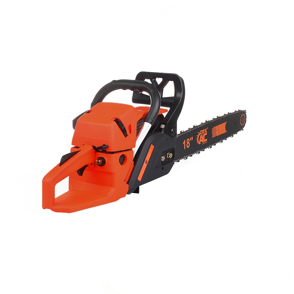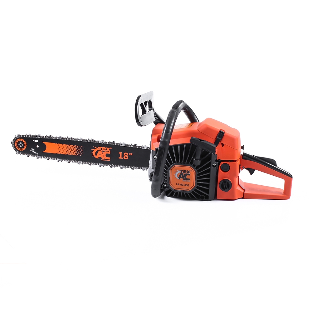 В бензиновой цепной пиле Тех.АС ТА-03-053 установлена ключевая система натяжения цепи. Данная система проста и не требует особого ухода. С помощью установленного в бензопиле винта-натяжителя и ключа, входящего в комплект, оператор в любой момент может сделать натяжку или ослабление цепи. Когда винт проворачивается происходит смещение установленной шины, изменяя расстояние между ведущей звездой и шиной. В бензиновой цепной пиле установлена шина длиной 457мм. Преимуществом данной шины является возможность проводить распиловку больших стволов, бревен и других древесных материалов большого диаметра. Это поможет пользователю сэкономить время и силы, затрачиваемые на рабочий процесс. Для увеличения механической надежности в Тех.АС ТА-03-053 устанавливается крышка стартера выполненная из противоударного пластика. Расположенные ребра жесткости выступают радиатором, что в значительной степени увеличивает теплоотвод, а также снижает вес конструкции. Для облегчения запуска установлена система легкий старт. Благодаря этому затраченное время на запуск пилы снижено до 30%.