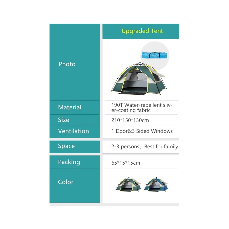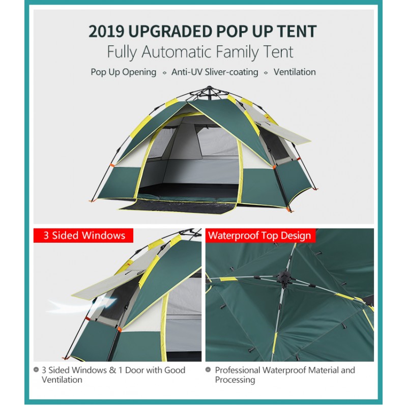 Автоматическая 3-местная палатка оснащена тремя окнами, за счёт которых палатка имеет хорошую вентиляциюю.  Габариты палатки в разложеном виде 200х150х130. Установка палатки займёт 3 минуты. В комплекте идёт компактный чехол для транспортировки, габариты в собраном виде 65х15х15.