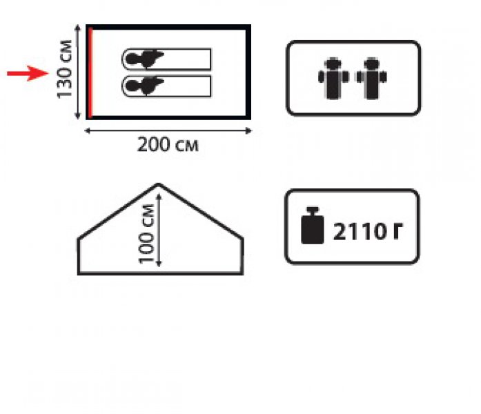- Тент: 100% полиэстер 75D/190T WR PU 2000 мм в ст - Дно: Армированный полиэтилен (терпаулинг) - Каркас: стальные трубки 16 мм - Вес: 2.1 кг