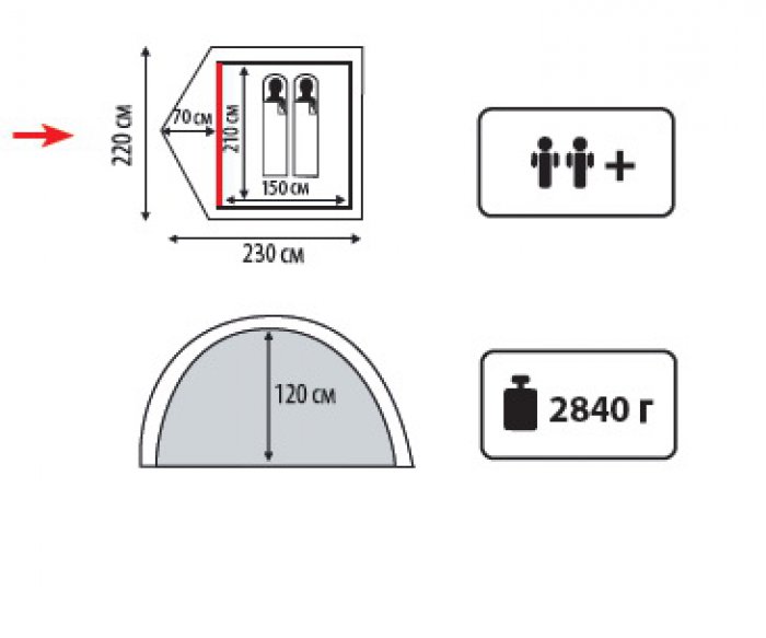 - Тент: наружный -100% полиэстер 75D/190T WR PU 2000 мм в ст., внутренний - 100% дышащий полиэстер 65D/68D 190T