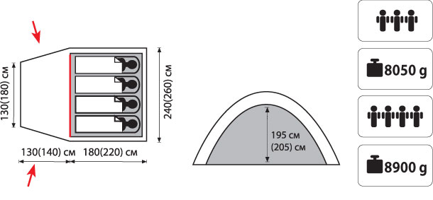 - Внутр. палатка: 100% дышащий полиэстер