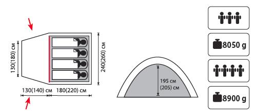 - Тент: полиэстер Diamond RipStop 75D/190T WR PU, 4000 мм в ст