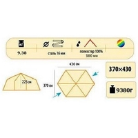 Tramp Light Mosquito представляет собой большой шестигранный кемпинговый тент-шатер на прочном стальном каркасе. Если вам в походе необходимо где-то разместить столовую кухню или кают-компанию для сбора обитателей туристического лагеря, данная модель – идеальный вариант. Размер шатра 3.5 метра на 4.7, высота - 2.25 метра, что позволяет стоять высокому взрослому человеку в полный рост не сгибаясь. Тент оснащен по периметру противомоскитной сеткой, благодаря чему вы будете надежно укрыты от надоедливых насекомых. В летнюю жару Mosquito прекрасно вентилируется. Швы хорошо загерметизированы термоусадочной лентой, что обеспечивает защиту от влаги. Поэтому даже в случае дождя ваш шатер совершенно не пострадает. Материал, из которого изготовлен тент, пропитан специальным составом, предотвращающим распространение огня. Тент-шатер прочно крепиться к металлическим стойкам, расположенным по периметру и имеет два входа . Для установки или разборки тента Mosquito вам понадобится минимум времени. Конструкция каркаса не предусматривает изгибаемых элементов, которые со временем имеют свойство разрушаться. Советуем Вам также обратить внимание на похожие шатры в нашей коллекции: особенно на модель Tramp Mosquito LUX (V2) с дополнительным подстегивающимся полом, стойками для пологов над входами и более высокими показателями водонепроницемости ткани. Особенности : Палатка-шатер с двумя входами Тент оборудован юбкой Удобные большие размеры Противомоскитная сетка и убирающаяся защита от дождя Идеальна для отдыха на открытом воздухе в летнее время, спасает от легкой непогоды, солнца и насекомых Характеристики Тент: 100% Полиэстер 75D/190T WR PU 4000 мм в ст. Цвет: оранжевый Каркас: сталь 16 мм Вес: 9,5 кг. Размер: 370*430*225 см. Размер в упаковке: 23x78x30 см