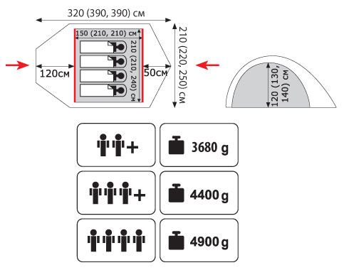 - Внутр. палатка: 100% дышащий полиэстер