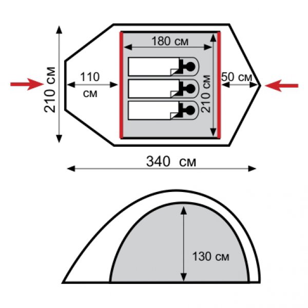 - Палатка имеет наружный каркас из двух основных и одной вспомогательной дуги