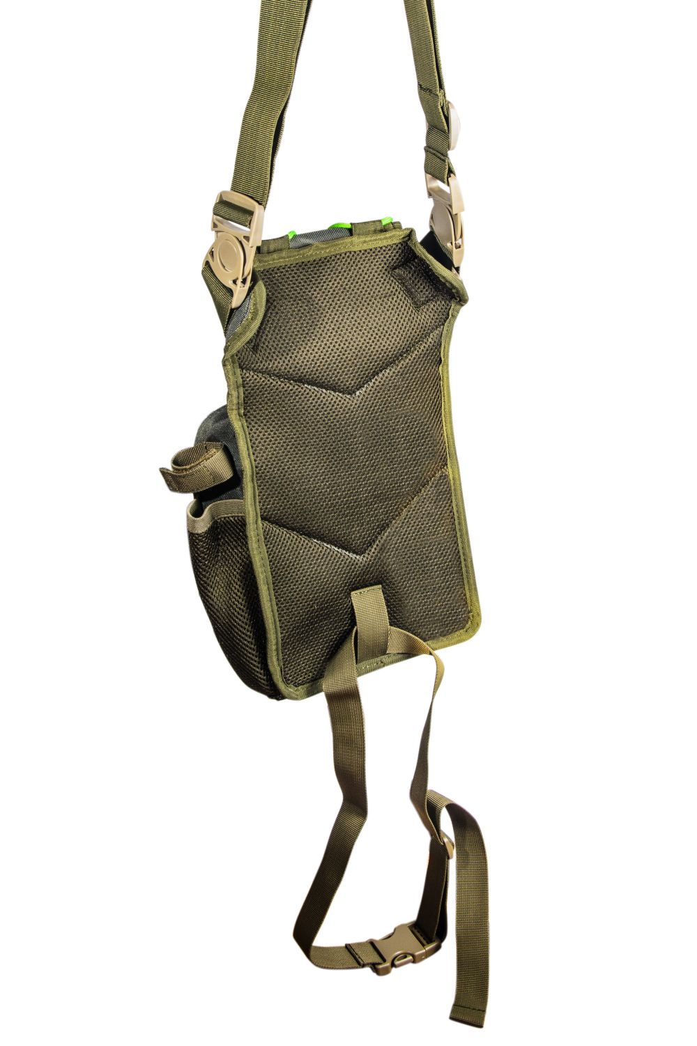 С боку сумки – карманчик-держатель для спиннинга, а так же стропа на липучке с пластиковой петлей для крепления дополнительного снаряжения. Эта модель пошита из прочного влагостойкого материала темно-зеленого цвета. Характеристики: