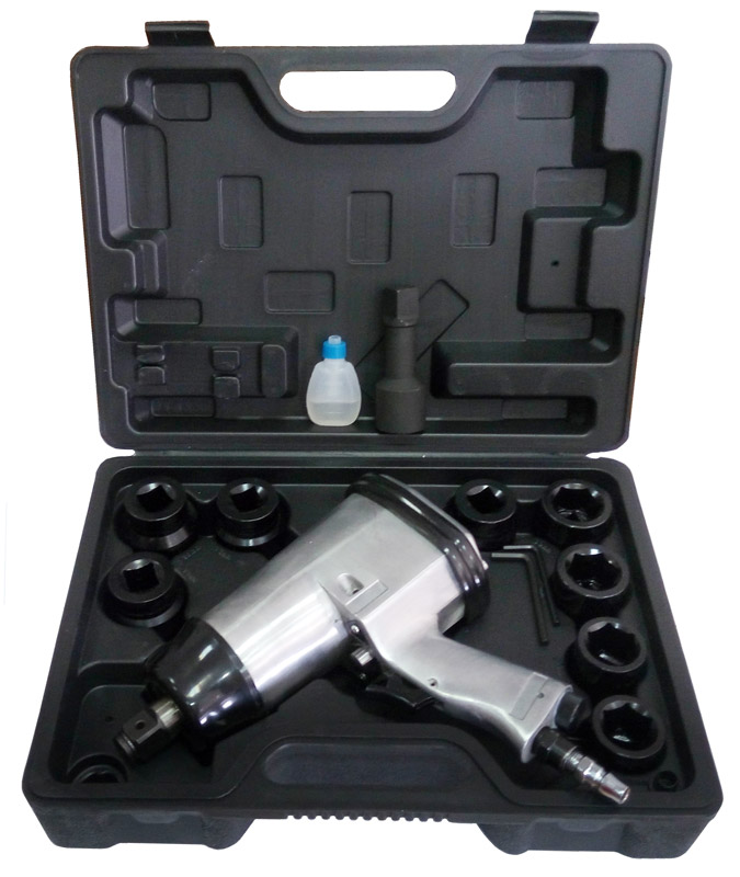 Пневмогайковерт К-4100К поставляется в пластиковом противоударном кейсе, полностью укомплектованном всем необходимым инструментом.