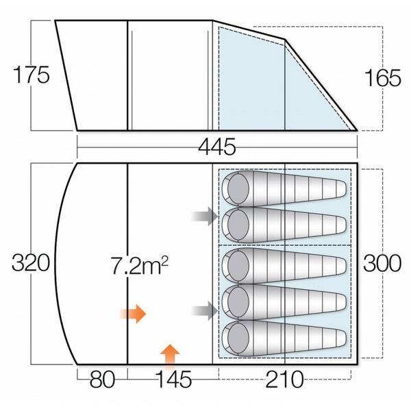 В просторном тамбуре площадью 7,2 м² с навесом от солнца или дождя свободно можно разместиться для отдыха всем пользователям палатки, устроить походную кухню или дополнительные спальные места. Туннельная конструкция предоставляет наибольший полезный объем по отношению к весу палатки. При этом запатентованная система TBS®II обеспечивает жесткость и надежность всей конструкции при сопротивлении ветровой нагрузке. Возможность установки одновременно внешнего тента с закрепленной в нем внутренней палаткой гарантирует, что даже при установке в дождь внутренняя палатка останется сухой. Кроме того, палатка имеет достаточно высокий уровень водозащиты. Модель соответствует основным требованиям согласно стандарта Европейского союза EN5912.