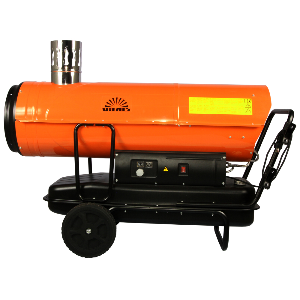 Дизельный обогреватель с непрямым типом нагрева Vitals DHC-501 относится к промышленному отопительному оборудованию, работающему на дизельном топливе. Данная модель незаменима в тех случаях, когда имеется возможность осуществить вывод отработавших газов наружу помещения через специальный газоотвод. Дизельный обогреватель Vitals DHC-501 – компактное мобильное устройство, предназначенное для эффективного обогрева производственных и вспомогательных помещений большого объема (строительные объекты, склады, гаражи, торговые павильоны, теплицы, оранжереи и т.д.). Данное устройство после включения сразу же готово к использованию по назначению и не требуют дополнительного времени на разогрев. Модель Vitals DHC-501, обладающая тепловой мощностью 50 кВт, способна быстро обогреть помещение площадью до 500 м² (высота потолка не более 3 м). При этом помещение должно быть надлежащим образом утеплено, а также иметь небольшие тепловые потери. Отсутствие выброса продуктов сгорания в отапливаемое помещение позволяет использовать эту модель для обогрева помещений, в которых присутствуют люди и животные.