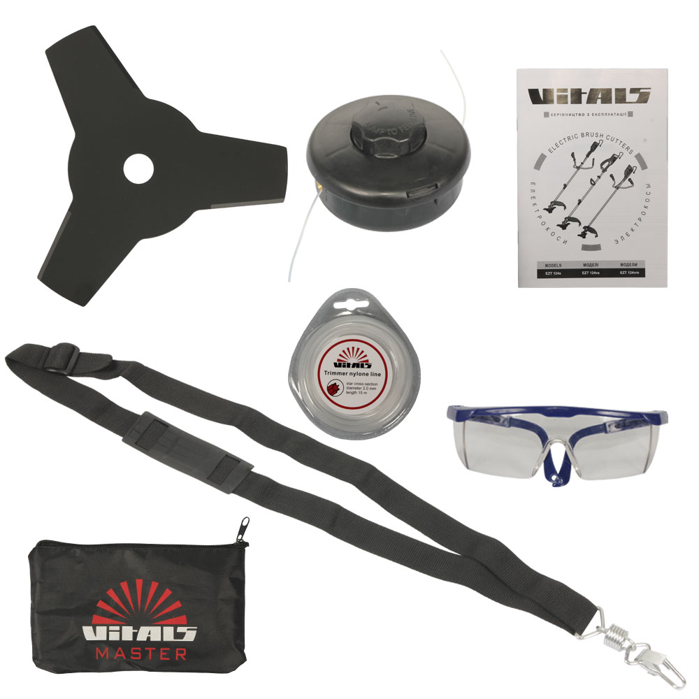 Вопросы безопасности на достаточно высоком уровне. Кнопка запуска двигателя имеет защиту от случайного включения. Чтобы избежать травм при попадании режущего инструмента на сторонние предметы и их отскоке в сторону пользователя, предусмотрен большой защитный кожух, изготовленный из достаточно прочного пластика. В плане комфортности также все продумано. Наплечный ремень с карабином позволяет осуществить регулировку длины ремня отдельно от электрокосы и в считанные секунды подсоединить ремень к изделию. Для обеспечения наилучшего положения изделия, исходя из предпочтений и физических данных пользователя, можно изменять положение рукоятки. Модель Vitals Master EZT 144vs оборудована раздельной велосипедной рукояткой с возможностью регулировки одной части независимо от другой. Таким образом, работать электрокосой очень комфортно, не чувствуя при этом усталости на протяжении длительного периода времени. В зависимости от того, какая растительность подлежит скашиванию, модель Vitals Master EZT 144vs может использовать специальный 3-зубовый нож или шпулю с леской. При этом диаметр скашивания растительности ножом составляет 255 мм, а шпулей – 420 мм. Электрокоса Vitals Master EZT 144vs имеет богатую комплектацию. В комплект поставки изделия входят: раздельная велосипедная рукоятка, защитный кожух с неподвижным ножом, наплечный ремень с карабином, 3-зубовый нож. Помимо стандартного набора дополнительно в комплекте сумка с запасными инструментами и принадлежностями, а также шпуля с упрощенной заправкой лески, что позволяет подготовить шпулю для работы без каких-либо усилий и в считанные секунды.