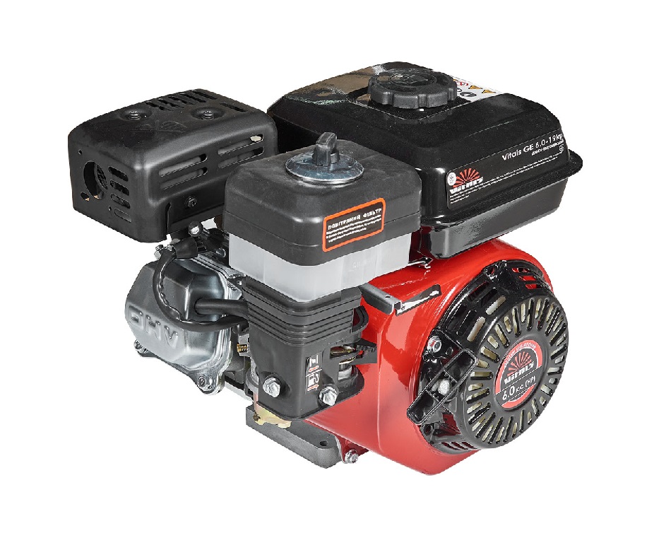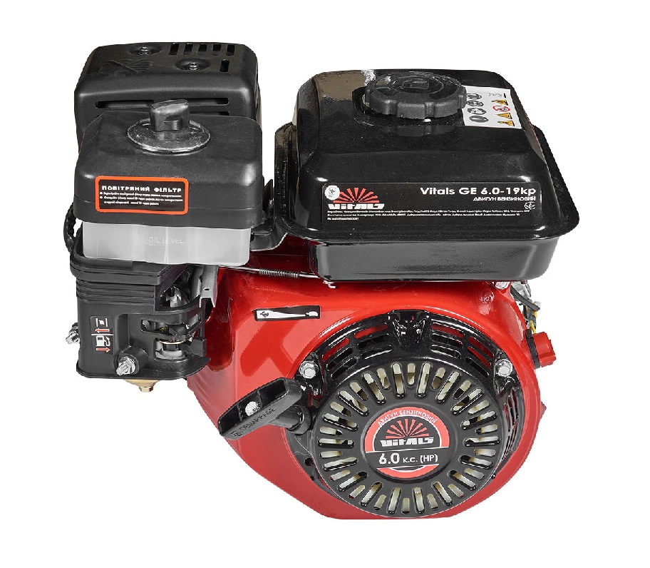 Двигатель внутреннего сгорания Vitals GE 6.0-19kp — универсальный бензиновый одноцилиндровый четырехтактный двигатель общего назначения c воздушным охлаждением. Отличительной особенностью модели Vitals GE 6.0-19kp является наличие шкива на два ручья под клиновый ремень профиля B(Б). Двигатель внутреннего сгорания Vitals GE 6.0-19kp мощностью 6,0 л. с. и рабочим объемом 196 см3, может использоваться в составе мини-электростанций, в сельскохозяйственной технике: мотоблоках, мотокультиваторах, косилках, самоходных шасси, ирригационных и оросительных системах, в строительном оборудовании: виброплитах, ударных трамбовках, бетономешалках, компрессорах, насосах и помпах. Крепление двигателя — универсальное. Высокий уровень качества комплектующих, профессиональная сборка и двухуровневая фильтрация воздуха, которая обеспечивается поролоновым фильтром и масляной ванной, гарантируют длительный срок эксплуатации двигателя.