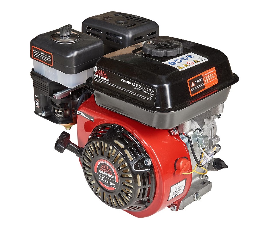 Двигатель внутреннего сгорания Vitals GE 7.0-19k — универсальный бензиновый одноцилиндровый четырехтактный двигатель общего назначения c воздушным охлаждением. Двигатель внутреннего сгорания Vitals GE 7.0-19k мощностью 7,0 л. с. и рабочим объемом 212 см3, может использоваться в составе мини-электростанций, в сельскохозяйственной технике: мотоблоках, мотокультиваторах, косилках, самоходных шасси, ирригационных и оросительных системах, в строительном оборудовании: виброплитах, ударных трамбовках, бетономешалках, компрессорах, насосах и помпах. Крепление двигателя — универсальное. Высокий уровень качества комплектующих, профессиональная сборка и двухуровневая фильтрация воздуха, которая обеспечивается поролоновым фильтром и масляной ванной, гарантируют длительный срок эксплуатации двигателя.