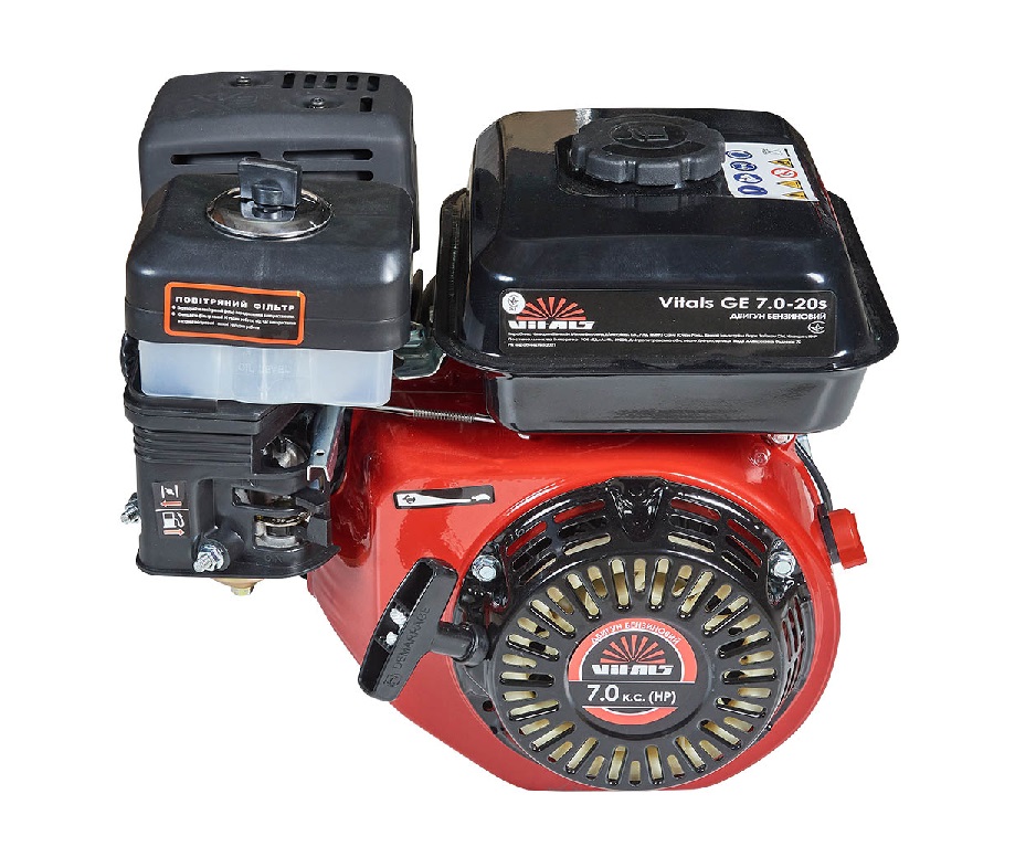 Двигатель внутреннего сгорания Vitals GE 7.0-20s — универсальный бензиновый одноцилиндровый четырехтактный двигатель общего назначения c воздушным охлаждением. Двигатель внутреннего сгорания Vitals GE 7.0-20s мощностью 7,0 л. с. и рабочим объемом 212 см3, может использоваться в составе мини-электростанций, в сельскохозяйственной технике: мотоблоках, мотокультиваторах, косилках, самоходных шасси, ирригационных и оросительных системах, в строительном оборудовании: виброплитах, ударных трамбовках, бетономешалках, компрессорах, насосах и помпах. Крепление двигателя — универсальное. Высокий уровень качества комплектующих, профессиональная сборка и двухуровневая фильтрация воздуха, которая обеспечивается поролоновым фильтром и масляной ванной, гарантируют длительный срок эксплуатации двигателя.