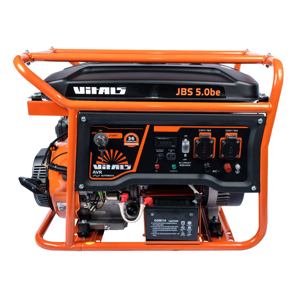 На данном силовом агрегате установлен современный автоматический регулятор напряжения (AVR), обеспечивающий стабильным выходным напряжением во всем диапазоне нагрузок. Качество энергии электростанции позволяет смело использовать ее для обеспечения электропитанием бытовых и специальных потребителей, сложного электронного оборудования, а также средств связи (телевизоров, компьютеров, холодильников, отопительных котлов, насосов, электродвигателей и т.д.). Для защиты от перегрузки электрической цепи предусмотрены автоматические предохранители переменного и постоянного токов. Отличительной особенностью данной модели является наличие электронного модуля «3 в 1», на цифровом табло которого отображается информация о выходном напряжении, частоте тока на выходе, а также отработанных моточасах. Модель Vitals JBS 5.0b оборудована выводом постоянного тока напряжением 12 В, который предназначается, в основном, для зарядки автомобильных аккумуляторных батарей. Чтобы не повредить двигатель при отсутствии масла в картере или его недостаточном количестве, предусмотрена аварийная система защиты, которая остановит двигатель, тем самым предотвратит выход его из строя.