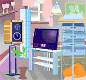 Желательно, чтобы телевизор, точнее — центр его экрана, располагался примерно на уровне глаз сидящего напротив зрителя. Ясно, что здесь из-за необходимости соблюдать санитарно-гигиенические рекомендации большого разброса в размерах разных моделей не бывает. К подставкам для аудиоаппаратуры каких-либо особых требований по высоте не выдвигается. Однако если учесть, что в состав компонентной стереофонической Hi-Fi-системы может входить минимум пара блоков высотой 100–150 мм (CD-проигрыватель и стереоусилитель), а серьезно оснащенный аудиокомплекс — это уже 5–7, а то и более блоков, общая высота стойки определяется количеством полок и может составлять от 400 до 1200 мм… Здесь стоит упомянуть, что для обеспечения щадящего теплового режима работающей аппаратуры желательно выбирать высоту полок побольше (так легче организовать естественное охлаждение конвекцией). |  |